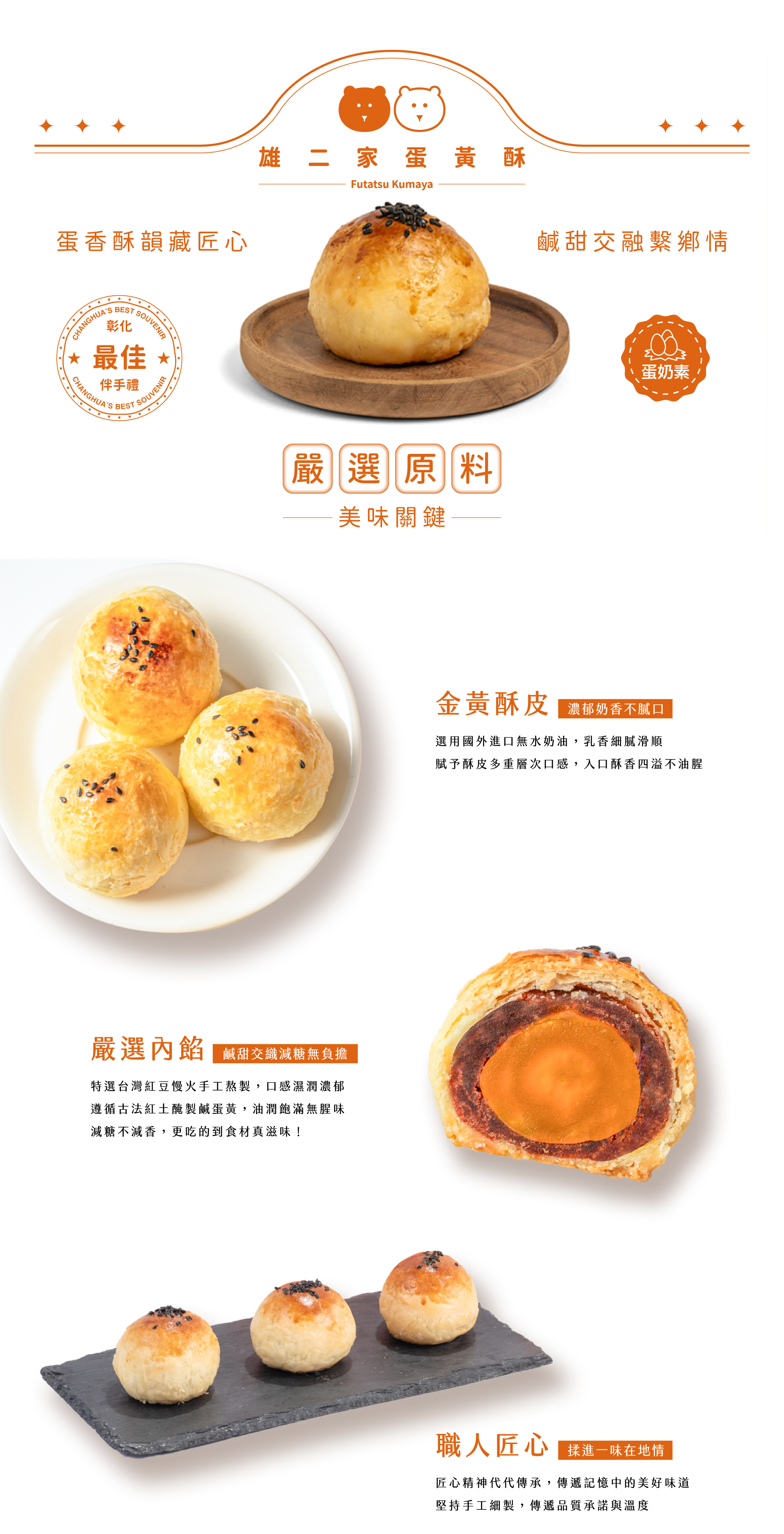 雄二家招牌蛋黃酥傳承匠心工藝,堅持每日手工現做。餅皮選用國外進口無水發酵奶油製成,乳香濃郁不膩口,手桿層層餅皮金黃酥香,內餡嚴選紅豆漫火熬煮,包覆本土特級鹹蛋黃,健康減糖配方吃得出食材天然好滋味,入口即化香氣四溢,讓人一吃就愛上!