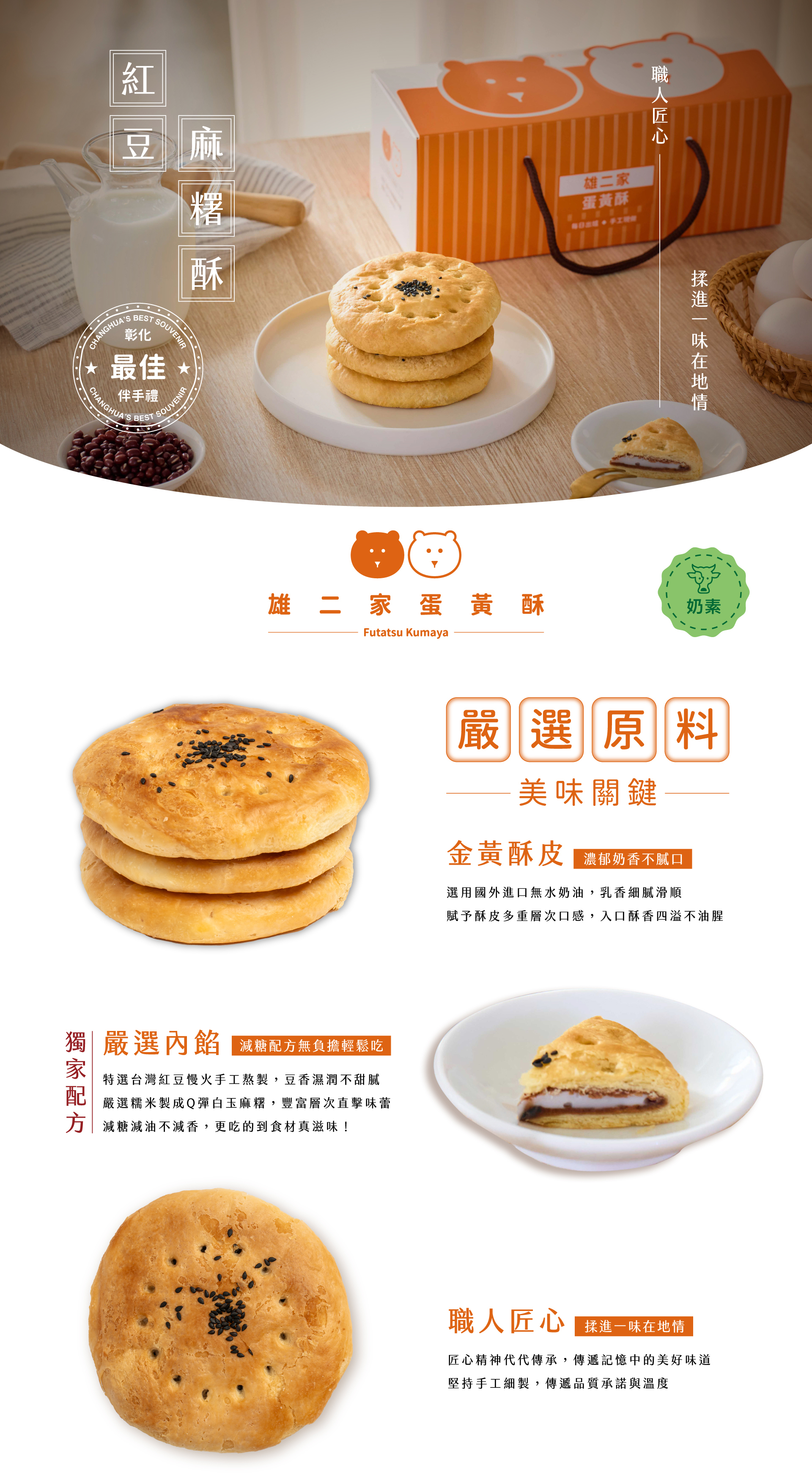 雄二家紅豆麻糬酥,復刻記憶中簡單純粹的好滋味!嚴選國外進口無水奶油,打造層層金黃酥皮,一口咬下奶香四溢。內餡選用本土紅豆慢火熬製,搭配軟Q彈牙的白玉麻糬,口感豐富滿足。保留食材天然風味,使用減糖減油配方,完美復刻經典好滋味。