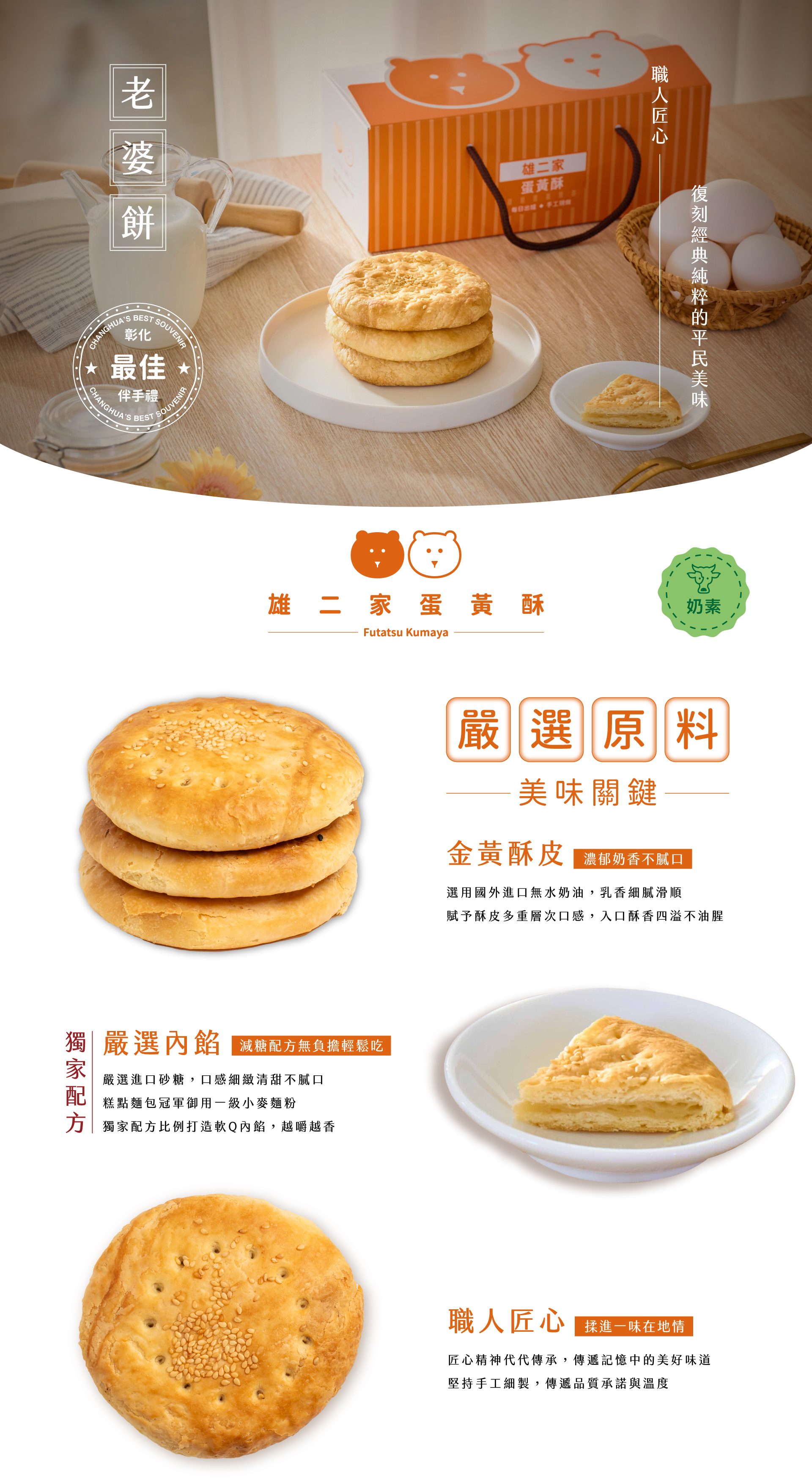 雄二家老婆餅,復刻經典純粹的平民美味。嚴選國外進口無水奶油,打造層層金黃酥皮,一口咬下奶香四溢。內餡嚴選一級小麥麵粉與進口砂糖,獨家配方比例打造完美平衡的內餡,清新香甜不膩口,越嚼越香越帶勁!