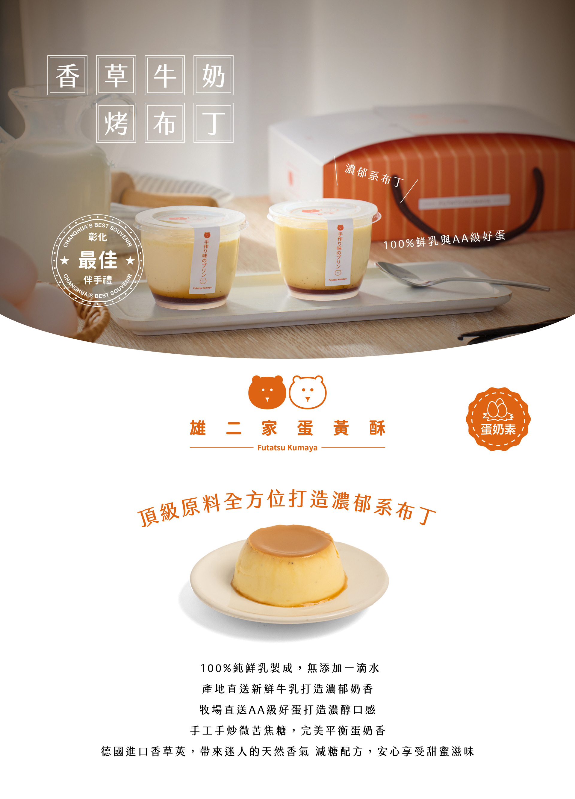 雄二家香草牛奶烤布丁,100%純鮮乳製成,享受新鮮牛乳的濃郁奶香。選用牧場直送AA級雞蛋,打造濃醇滑順口感,最後淋上手工焦糖,微苦的香氣完美平衡蛋香與奶香!減糖配方,安心享受甜蜜滋味。
